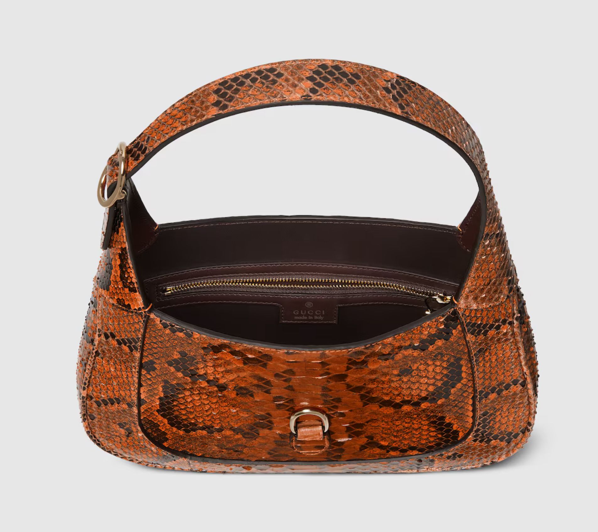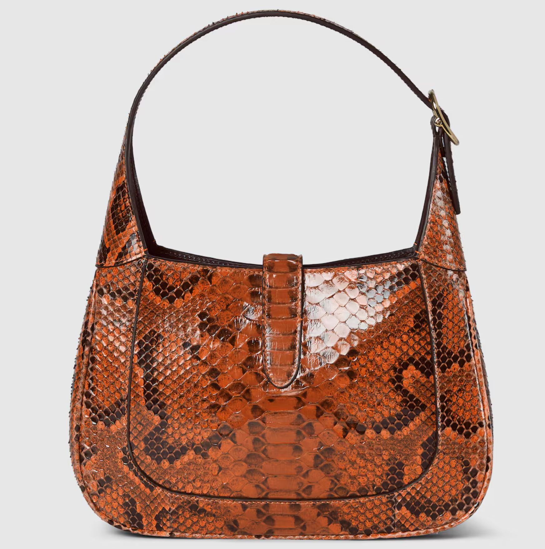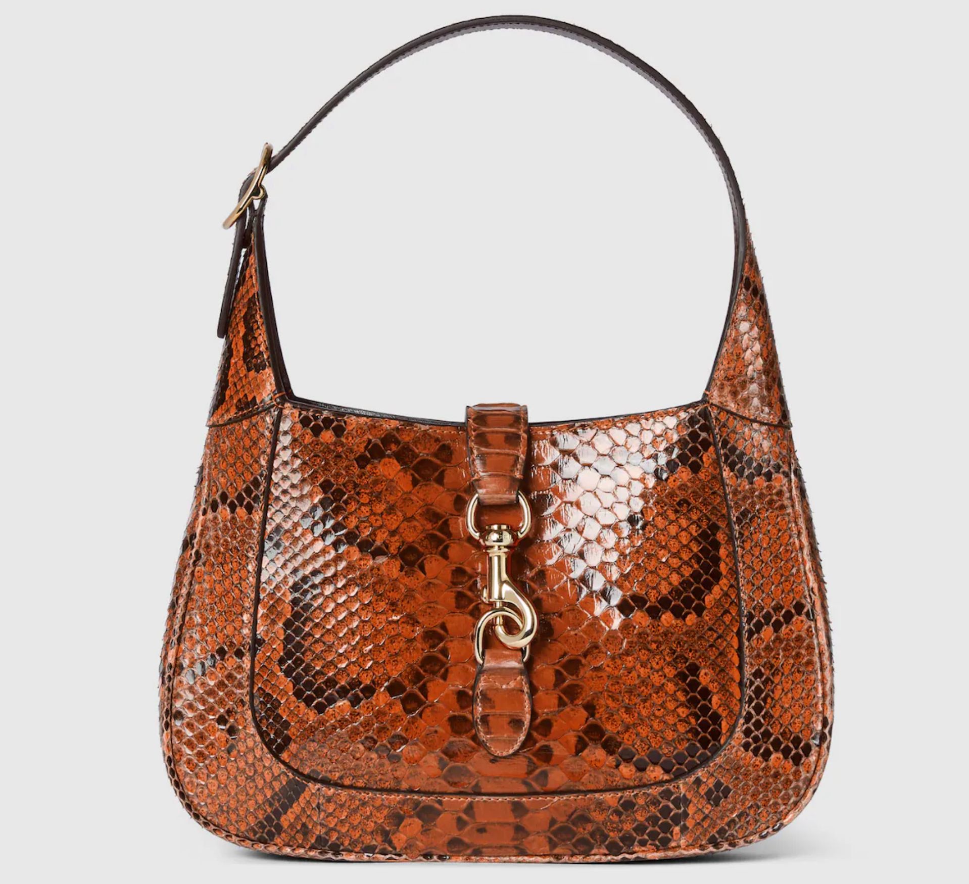 This Gucci Jackie, crafted from orange python, highlights the craftsmanship, crescent shape, and sleek silhouette of the House’s signature shoulder bag. The light gold-toned hook closure and two straps give this medium shoulder bag further styling options.
