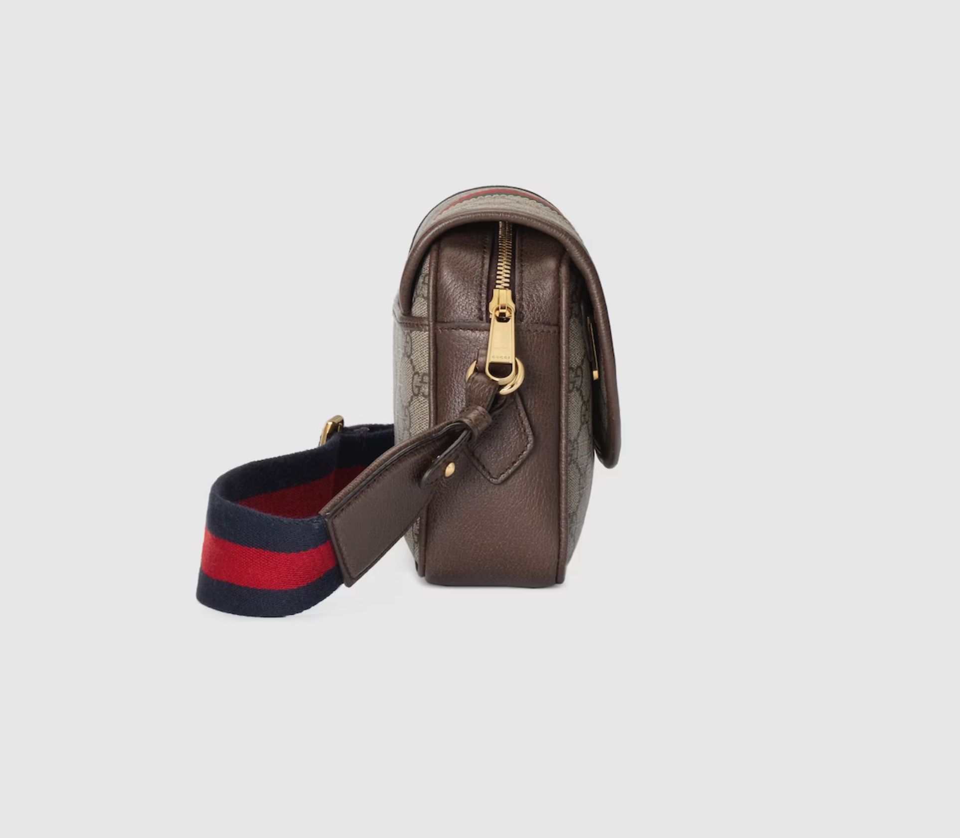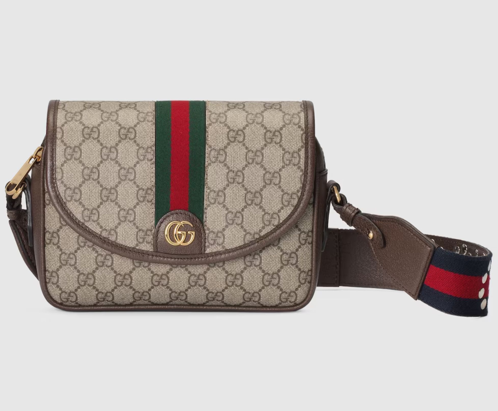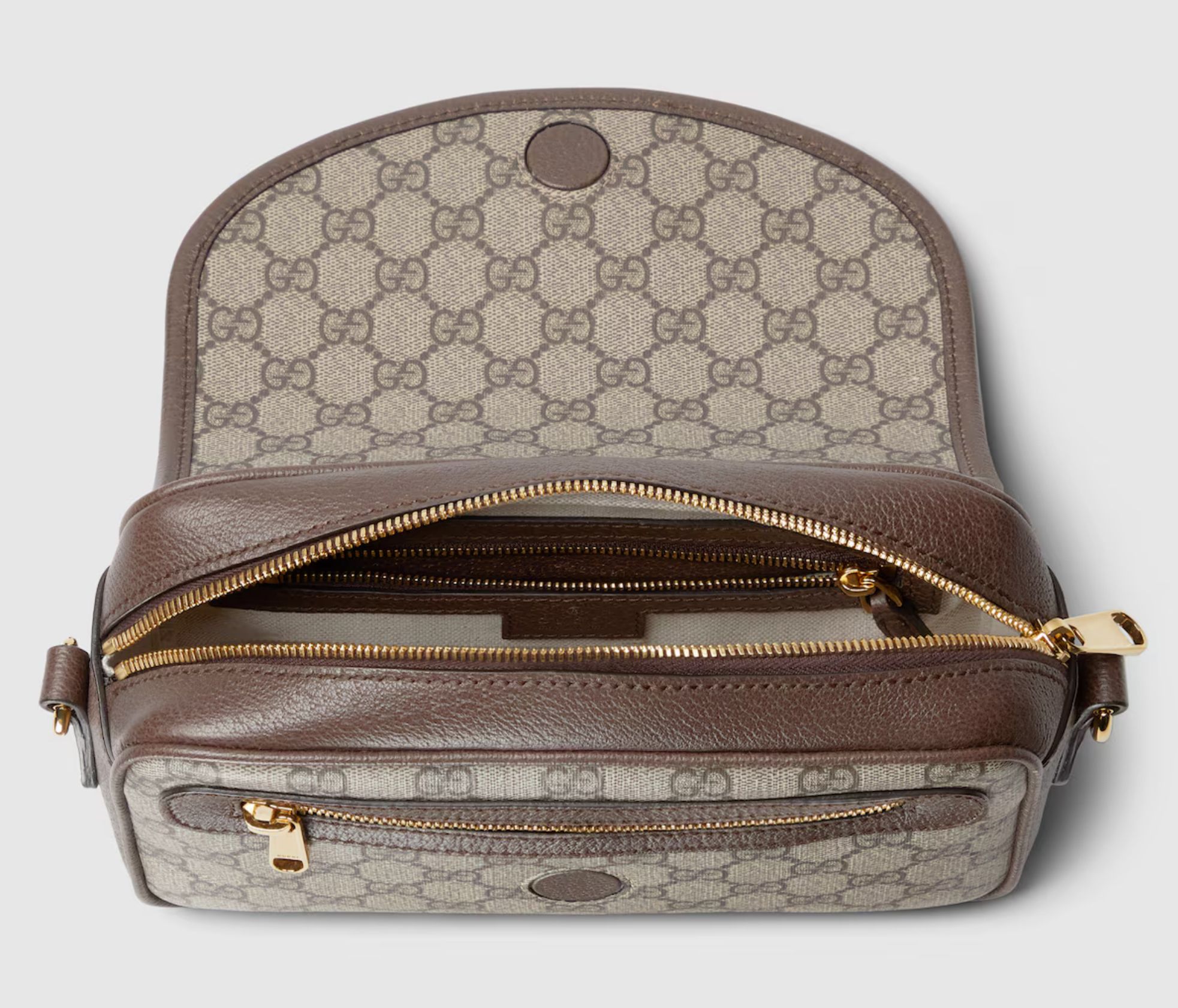 Ophidia is reinvented in new and unexpected ways. Metal eyelets and studs define the historical silhouette to create a one-of-a-kind take on the archival style. Creating a playful contrast, the small-sized shoulder bag is crafted from the House’s signature GG Supreme in the traditional color combination of beige and dark brown.